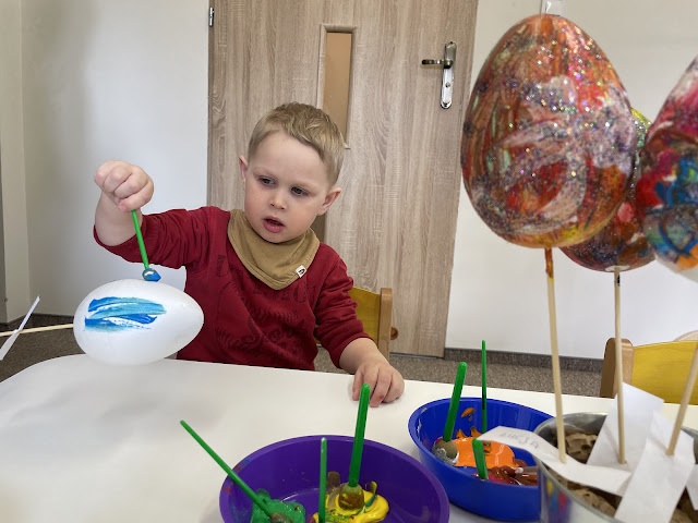 Początek kwietnia był w naszym żłobku okresem przygotowań do zbliżających się Świąt Wielkanocnych. Dzieci miały okazję poznać tradycje i zwyczaje związane z tym wyjątkowym czasem. Rozmawialiśmy o wielkanocnych palmach, święconce, którą przygotowuje się do koszyczka, tradycyjnym śniadaniu wielkanocnym, pisankach oraz śmigusie – dyngusie. W tym miejscu chciałybyśmy serdecznie podziękować – babci Stasia Nowickiego – za przygotowanie do naszych zajęć, przepięknej palmy wielkanocnej!